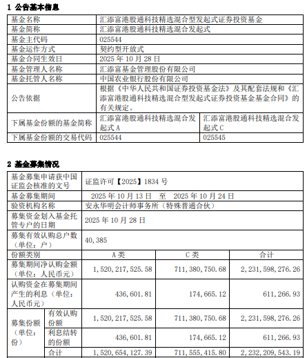 中国经济网北京10月29日讯 今日,汇添富基金发布汇添富港股通科技精选混合型发起式证券投资 基金基金合同生效公告。 | 基金募集申请获中国 | | 证监许可【2025】1834号 | | | | --- | --- | --- | --- | --- | | 证监会核准的文号 | | | | | | 基金募集期间 | | 2025年10月13日 至 2025年10月24日 | | | | 验资机构名称 | | 安永华明会计师事务所(特殊普通合伙) | | | | 募集资金划入基金托 | | 2025年10月28日 | | | | 管专户的日期 | | | | | | 募集有效认购总户数 | | 40. 385 | | | | (单位:户) | | | | | | 份額类别 | | A类 | C 英 | 合计 | | 豪集期目净认购金额 | | 1,520, 217, 525. 58 | 711, 380, 750, 68 | 2,231,598,276.26 | | (单位:人民币元) | | | | | | 认购资金在载集期间 产生的利息(单位: | | 436,601.81 | 174.665. 12 | ...