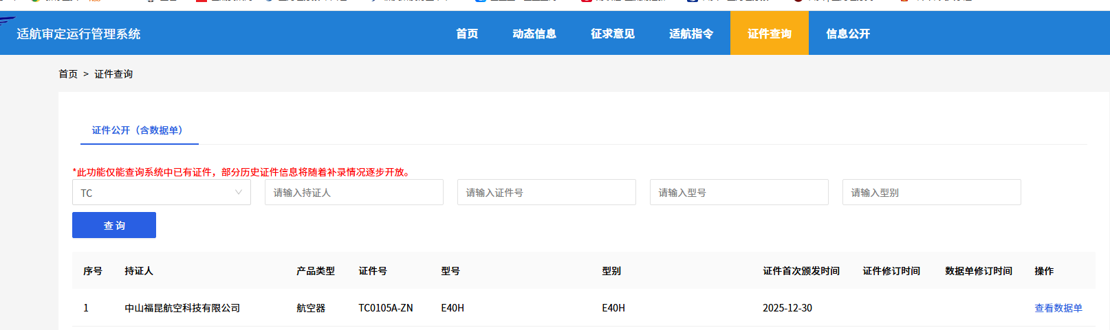 来源:上海证券报·中国证券网 上证报中国证券网讯(记者何治民)12月30日,中国民航局适航审定运行管理系统显示,御风未来旗下无人机企业中山福昆航空科技有限公司(以下简 称"福昆航空")型号为E40H的无人机成功获颁型号合格证,即TC证,编号为TC0105A-ZN。 对此,御风未来回应记者称,这是全球首个中型复合翼无人机型号合格证,也是全球首个混动无人机型号合格证。TC数据单显示,该型号合格证从2024年7 月29日申请,2025年12月30日正式批准,历时1年5个月。 对此,御风未来回应记者称,这是全球首个中型复合翼无人机型号合格证,也是全球首个混动无人机型号合格证。TC数据单显示,该型号合格证从2024年7 月29日申请,2025年12月30日正式批准,历时1年5个月。 TC数据单显示,E40H航空器机身全长3.78m,飞机全高0.99m,最大飞行速度为115km/h,最大飞行高度为1000m,最大起飞重量150公斤,空机重量100公 斤,最大载荷50公斤,最大飞行时间10小时(满油且最大起飞重量150kg),最大航程800公里(满油且最大起飞重量150kg)。 与此同时,TC数据单显示,该无人机的运行场景 ...