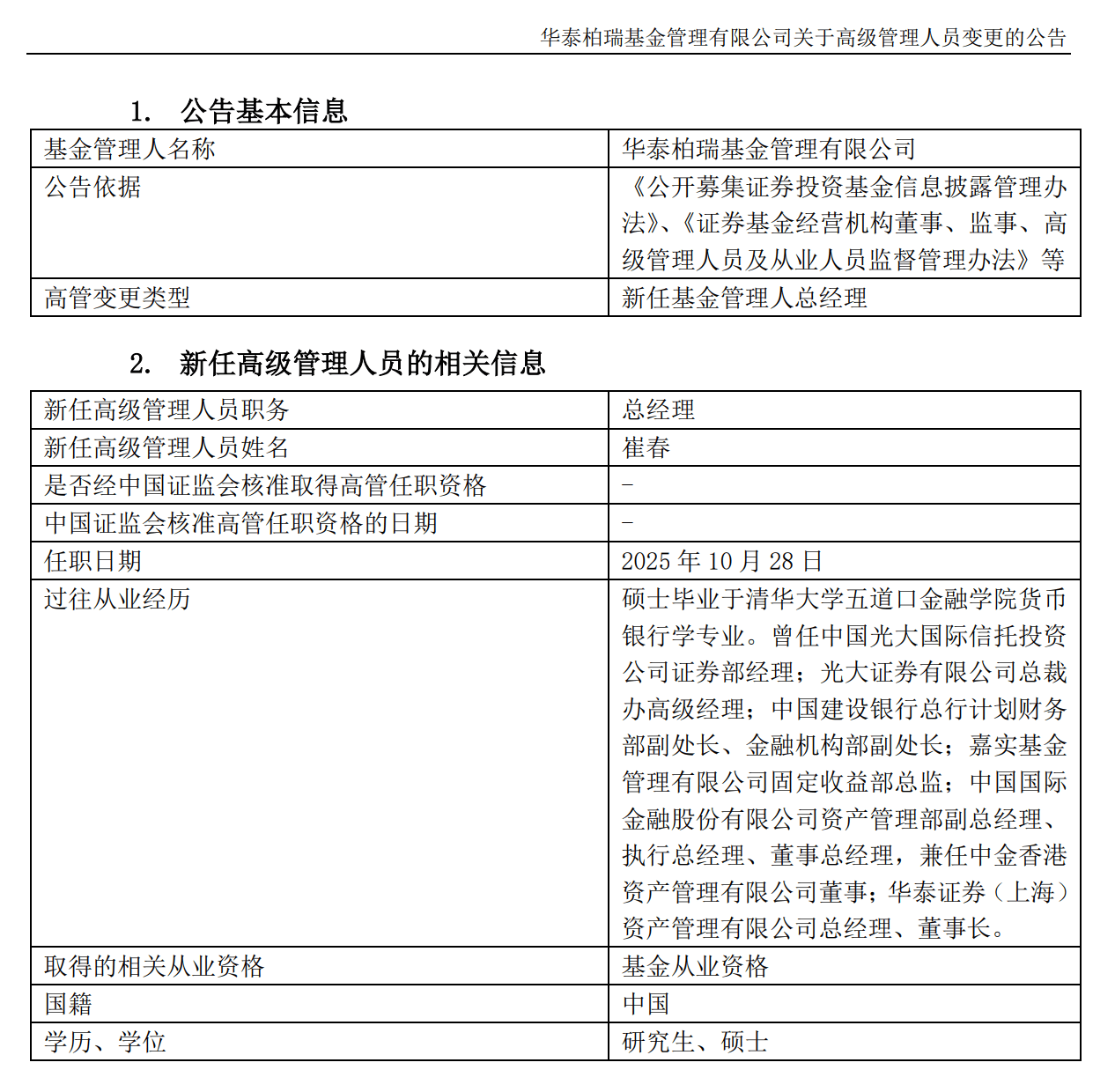 央广网北京10月28日消息(记者 冯方)10月28日,华泰柏瑞基金发布公告称,崔春自当日起任公司总经理职务,公司董事长贾波不再代行总经理职责。5月 9日,华泰柏瑞基金原总经理韩勇因工作调整离任,董事长贾波代为履职。 公开信息显示,崔春曾任华泰资管总经理、董事长,于10月24日卸任华泰资管董事长职务。在加入华泰资管前,崔春历任光大证券总裁办高级经理、建设银 行总行金融机构部副处长、嘉实基金固定收益部总监、中金公司资产管理部董事总经理等职务,拥有超过20年的金融从业经验。 | CHECK THE | | | --- | --- | | 基金管理人名称 | 华泰柏瑞基金管理有限公司 | | 公告依据 | 《公开募集证券投资基金信息披 | | | 法》、《证券基金经营机构董事、 | | | 级管理人员及从业人员监督管理 | | 高管变更类型 | 新任基金管理人总经理 | | 新任高级管理人员职务 | 总经理 | | --- | --- | | 新任高级管理人员姓名 | 崔春 | | 是否经中国证监会核准取得高管任职资格 | | | 中国证监会核准高管任职资格的日期 | | | 任职目期 | 2025年10月28日 | ...