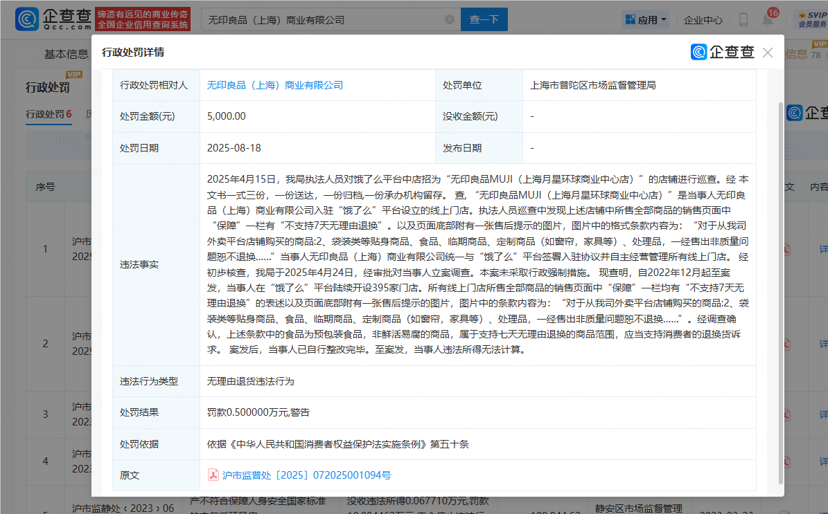 企查查APP显示,近日,无印良品(上海)商业有限公司因无理由退货违法行为被上海市普陀区市场监督管理局罚款5000元并警告。违法事实显示,该公司 所有线上门店所售全部商品的销售页面中"保障"一栏均有"不支持7天无理由退换"的表述以及页面底部附有一张售后提示的图片,图片中的条款内容为:"对 于从我司外卖平台店铺购买的商品:2、袋装类等贴身商品、食品、临期商品、定制商品(如窗帘,家具等)、处理品,一经售出非质量问题恕不退 换……"。 经调查确认,上述条款中的食品为预包装食品,非鲜活易腐的商品,属于支持七天无理由退换的商品范围,应当支持消费者的退换货诉求。 | | | 无印良品(上海) 商业有限公司 × 商一下 十六月ア | | | --- | --- | --- | --- | | 具不信息 | 行政处罚详情 | @ 个看看 | | | VIP 行政处罚 | 行政处罚相对人 | 无印良品(上海) 商业有限公司 处罚单位 上海市普陀区市场监督管理局 | | | TRANS 6 | 处罚金额(元) | 5.000.00 没收金额(元) | | | | 处罚目期 | 2025-08-18 发布日期 | | | 序号 | ...