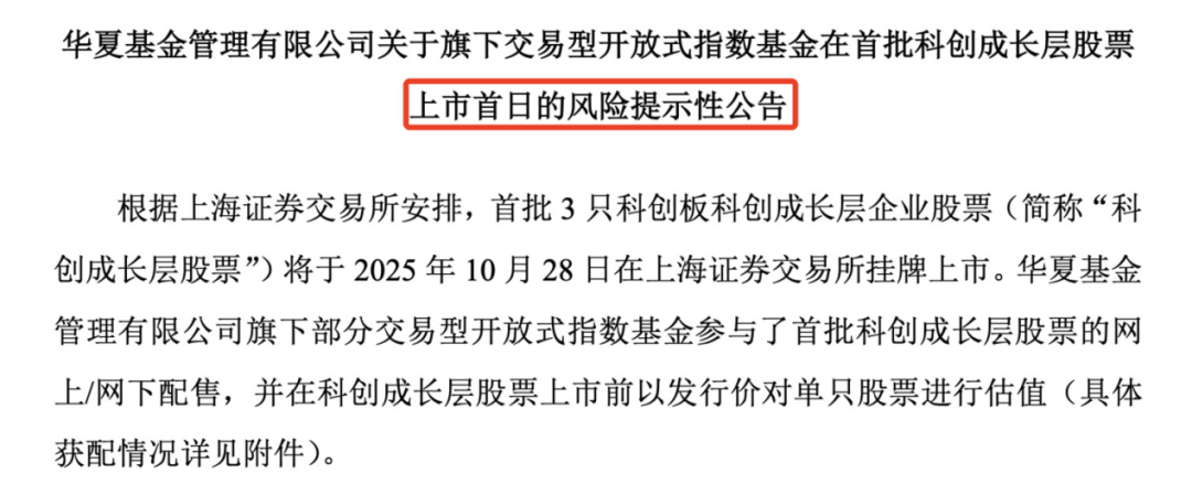 Core Viewpoint - The first batch of three Sci-Tech Innovation Board growth stocks was listed on October 28, with multiple ETFs that participated in the allocation issuing risk warnings regarding potential discrepancies between the ETFs' net asset values and the market prices of the newly listed stocks [1][2][4]. Group 1: Listing and ETF Participation - The first three registered companies on the Sci-Tech Innovation Board, He Yuan Bio, Xi'an Yicai, and Bibet, officially listed on October 28 [2]. - Several ETFs, including those managed by Huaxia Fund, participated in the online and offline allocation of the first batch of growth stocks [2][6]. - The ETFs' indicative net asset value (IOPV) on the listing day only reflects the issue price of the growth stocks and does not account for market price fluctuations, leading to potential discrepancies [1][4]. Group 2: Allocation Results - Over 100 ETFs and their linked funds participated in the offline allocation, with A-class investors receiving significantly higher allocation ratios compared to B-class investors [5][7]. - The allocation ratios for A1, A2, A3, and B-class investors were 0.081%, 0.027%, 0.009%, and 0.0089%, respectively [5]. - The allocation amounts for individual stocks were limited, with none exceeding 0.1% of the ETFs' net asset values [7]. Group 3: Specific Allocation Data - Specific allocation data for the stocks included: - Bibet: Issued at 17.78 CNY, allocated 6,971 shares, totaling approximately 123,944.38 CNY, representing 0.0025% of the fund's net value [8]. - He Yuan Bio: Issued at 29.06 CNY, allocated 7,842 shares, totaling approximately 227,888.52 CNY, representing 0.0046% of the fund's net value [9]. - Xi'an Yicai: Issued at 8.62 CNY, allocated 32,866 shares, totaling approximately 283,304.92 CNY, representing 0.0057% of the fund's net value [9].