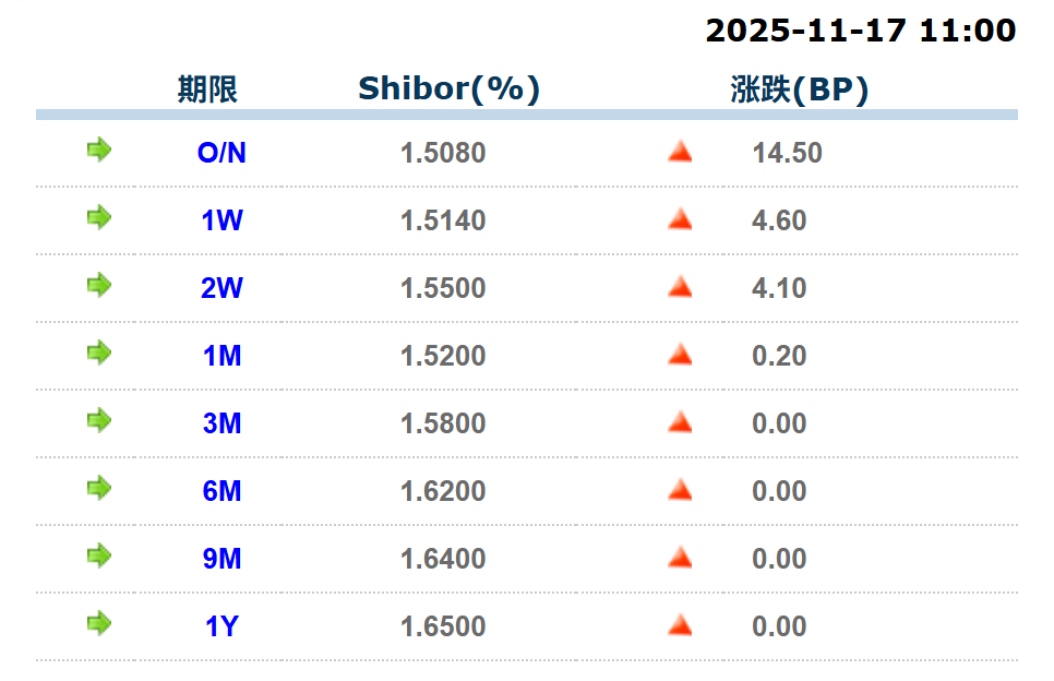 新华财经北京11月17日电(王春霞)人民银行17日开展2830亿元7天期逆回购操作,中标利率为1.4%,此外,将开展8000亿元买断式逆回购操作。当日公开 市场有1199亿元逆回购到期,净投放9631亿元。本周人民银行公开市场将有11220亿元逆回购到期,其中周一至周五分别到期1199亿元、4038亿元、1955亿 元、1900亿元、2128亿元。 上海银行间同业拆放利率(Shibor)隔夜品种全部上涨。具体来看,隔夜Shibor上涨14.50BP,报1.5080%;7天Shibor上涨4.60BP,报1.5140%;14天Shibor上 涨4.10BP,报1.5500%。 上海银行间同业拆放利率(11月17日) | | 期限 | Shibor(%) | 涨跌(BP) | | --- | --- | --- | --- | | 1 | O/N | 1.5080 | 14.50 | | f | 1W | 1.5140 | 4.60 | | 企 | 2W | 1.5500 | 4.10 | | 1 | 1M | 1.5200 | 0.20 | | 中 | 3M | 1.5800 | 0.00 | | 中 | 6M ...