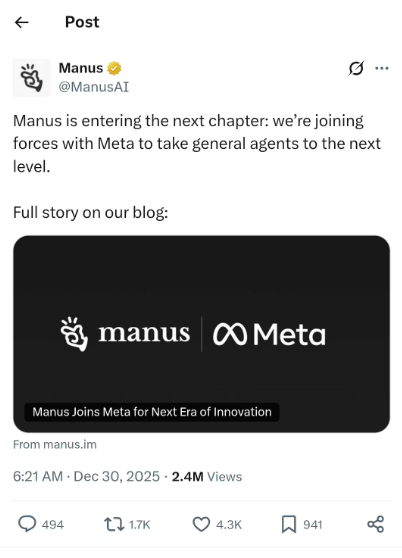 Manus帮助Meta补完了属于它的AI叙事 硅谷还在圣诞假期中,美股科技"七巨头"之一的 Meta 却玩了一笔大交易。 12月30日,由华人团队创立的通用AI智能体公司——Manus AI运营者蝴蝶效应公司宣布,被Meta 公司 收购。 Manus AI 官方社交媒体和公司创始人也确认了这一消息。 "Manus正在迈入新篇章:我们加入了Meta,致力将通用AI智能体带入下个阶段。"Manus AI官方社交平 台账号表示。 来源:Manus AI官方社交媒体账号 公司CEO肖弘表示:"加入 Meta 让我们能够在更强大,更可持续的基础上继续发展,而不会改变 Manus 的工作或决策方式。" 据透露,肖弘未来还将担任 Meta 公司的副总裁。但 Manus AI 团队依旧在新加坡展开业务,并独立运 营。 Meta 和 Manus AI 均未透露收购对价——不过考虑有消息指出此前 Manus AI 正在寻求估值为20亿美元 的新一轮融资,最终对价或高于以上水平。 Meta 巨资收购Manus的原因,硅谷和华人创业圈众说纷纭,但有一点是共识:Meta 暂时需要 Manus, 帮助自己完成属于 Meta 的AI叙事。 ...