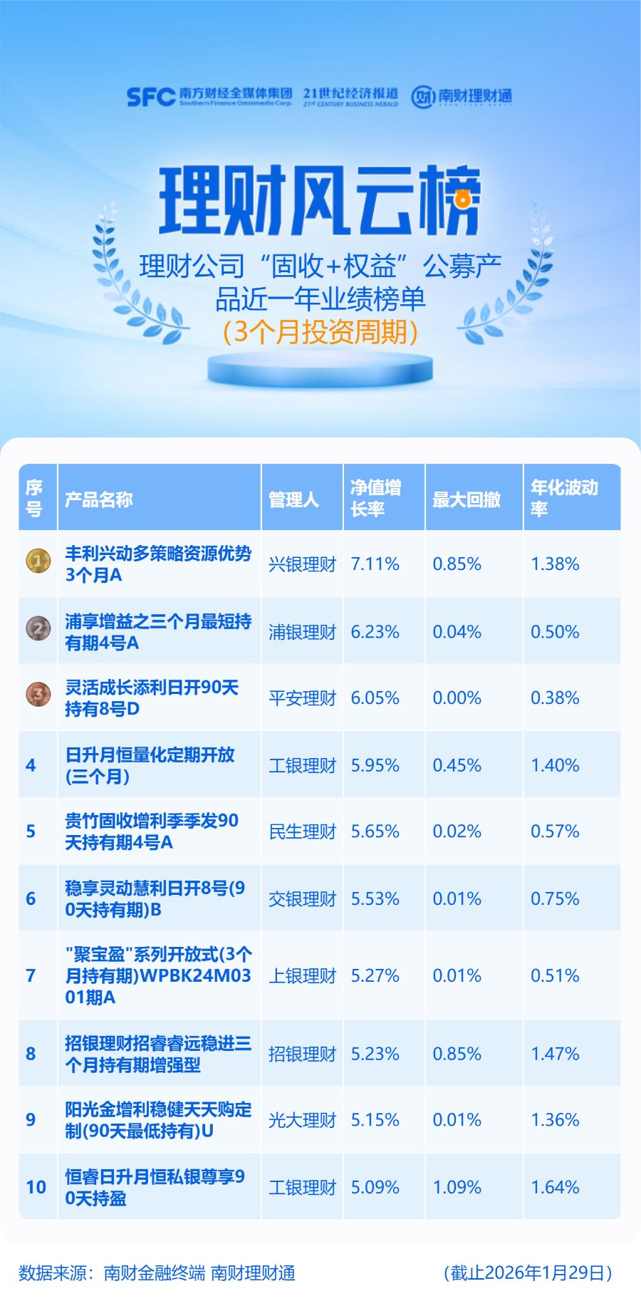Core Viewpoint - The article highlights the performance of "fixed income + equity" financial products in a volatile market, emphasizing the strong performance of the top-ranked product from Xingyin Wealth Management, which achieved a net value growth rate exceeding 7% over the past year [6][12]. Group 1: Product Performance - Xingyin Wealth Management's "Fengli Xingdong Multi-Strategy Resource Advantage 3-Month A" product leads the market with a net value growth rate of 7.11% and a maximum drawdown of only 0.85% [2][6]. - Other notable products include "Puxiang Zengyi 3-Month Shortest Holding Period 4 A" from Puxin Wealth Management and "Flexible Growth Add Profit Daily Open 90-Day Holding Period 8 D" from Ping An Wealth Management, both achieving over 6% net value growth [6][12]. Group 2: Market Context - The bond market is characterized by "low interest rates, high volatility, and structural differentiation," while the equity market shows significant fluctuations and rapid sector rotation, making single-asset investments more challenging [6][12]. - The "fixed income +" financial products are gaining popularity among investors as they adapt to the current macroeconomic environment through cross-market and multi-asset allocation strategies [6][12]. Group 3: Product Strategy - The top product aims for relative returns with a risk level classified as medium, utilizing a benchmark that combines bond and equity indices [7][10]. - The product's investment strategy focuses on balanced asset allocation across various sectors and stages of growth, avoiding over-reliance on any single industry or driver [10][11]. Group 4: Asset Management Insights - The product has a substantial asset scale of over 2.2 billion, reflecting investor confidence in its stable performance [10][11]. - The investment focus includes sectors with resource monopolies and technology, which are seen as key drivers of long-term economic growth amid macroeconomic uncertainties [11][12].