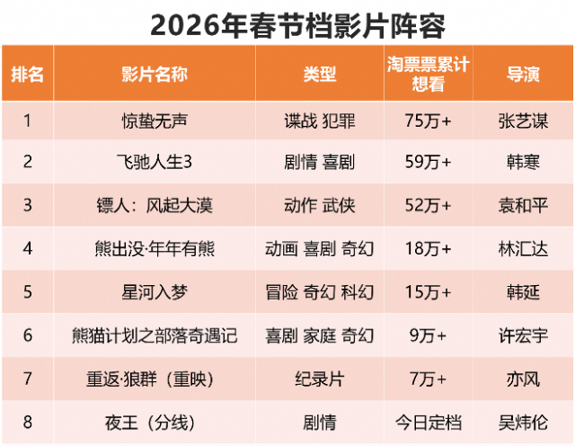 《惊蛰无声》《飞驰人生3》《镖人:风起大漠》位列想看人数前三。 截至目前,已有8部影片定档2026年春节档。其中,纪录片《重返·狼群》为重映影片,由黄子华、郑秀文主演的 粤语喜剧片《夜王》为分线发行,在两广地区(广东省、广西壮族自治区)限定上映。 | 排名 | 影片名称 | 类型 | 淘票票累计 想着 | 号演 | | --- | --- | --- | --- | --- | | 1 | 惊蛰无声 | 谍战 犯罪 | 75万+ | 张艺谋 | | 2 | 飞驰人生3 | 剧情 喜剧 | 59万+ | 韩寒 | | 3 | 镖人:风起大漠 | 动作 武侠 | 52万+ | 袁和平 | | 4 | 熊出没・年年有熊 | 动画 喜剧 奇幻 | 18万+ | 林汇达 | | 5 | 星河入梦 | 冒险 奇幻 科幻 | 15万+ | 韩延 | | 6 | 熊猫计划之部落奇遇记 | 喜剧 家庭 奇幻 | 9万+ | 许宏宇 | | 7 | 重返·狼群(重映) | 纪录片 | 7万+ | 亦风 | | 8 | 夜土(分线) | 剧情 | 今日定档 | 吴炜伦 | 2月6日,灯塔专业版发布《2026年春节档前瞻》。从 "想 ...