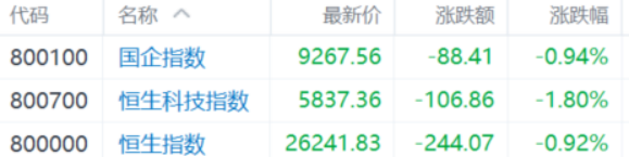 11月7日,港股三大指数低开后全天表现弱势,截止收盘,恒生指数跌0.92%报26241点,国企指数跌 0.94%报9267点,恒生科技指数跌1.8%报5837点。 | 代码 名称 ^ | 最新价 | | --- | --- | | 800100 国企指数 | 9267.56 -88.41 -0.94% | | 800700 恒生科技指数 5837.36 -106.86 -1.80% | | | 800000 | | 盘面上,大型科技股普遍表现低迷,半导体芯片股、汽车股等多数热门板块下跌,教育股、风电股等纷 纷走低。另一方面,多晶硅行业现拐点信号,新能源物料板块大涨,福莱特玻璃逆势上涨9%,信义光 能、协鑫科技皆强势,黄金股继续领衔有色金属股上涨,建筑材料板块走高,MOS HOUSE涨超12%。 | | | | | 地产发展商 | | 生物技术 | 黄金及贵金 | | --- | --- | --- | --- | --- | --- | --- | --- | | 银行 | 线上零售商 | 电讯服务 | 汽车 -0.77% | +0.21% | | -2.42% | +1.38% | | -0.02% | - ...