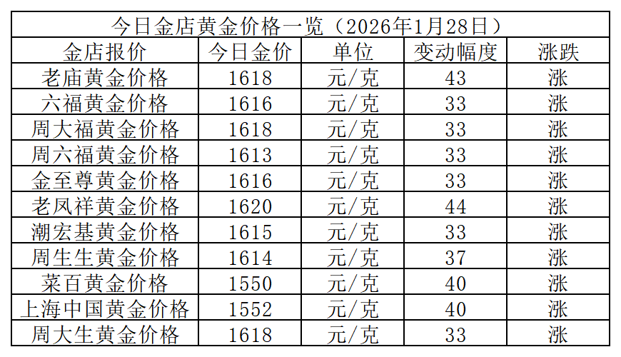 最高上涨44元!1月28日国内品牌金店金价突破1600元/克!
