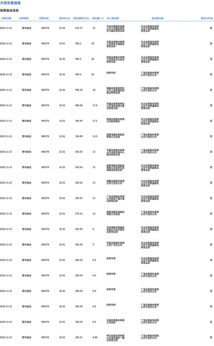 | 交易日期 | 证券調核 | 证券代码 | | | 成交价(元) 成交金额(万元) 成交量(*) 买入营业部 | 类出营业部 | | 是否为专场 | | --- | --- | --- | --- | --- | --- | --- | --- | --- | | 2025-11-13 | 野马电池 | 605378 | 22.51 | 472.71 | 21 | | 学习惯感觉 | 图 | | 2025-11-13 | 野马电池 | 605378 | 22.51 | 450.2 | 20 | 公司清算安装修 | FOR BE | 질 | | 2025-11-13 | 野马电池 | 605378 | 22.51 | 450.2 | 20 | | 台手表最高返 | 影 | | 2025-11-13 | 野马电池 | 605378 | 22.51 | 450.2 | 20 | 机构专用 | 公司 2000 100 | Ka | | 2025-11-13 | 野马电池 | 605378 | 22.51 | 405.18 | 18 | | 公司 2322 | る | | 2025-11-13 | 野马电池 | 60 ...