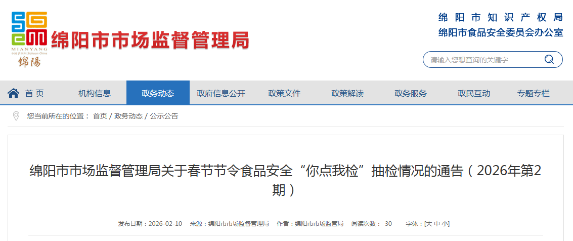 四川省绵阳市市场监督管理局关于春节节令食品安全“你点我检”抽检情况的通告(2026年第2期)