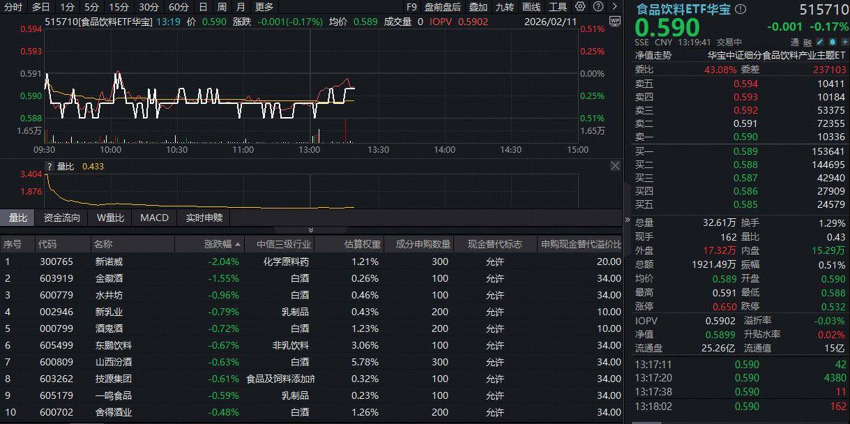 Core Viewpoint - The food and beverage sector is experiencing a pullback, with the Huabao Food and Beverage ETF (515710) showing a slight decline of 0.17% as of the latest update, influenced by significant drops in key stocks like XinNuoWei and JinHuiJiu [1][3]. Group 1: Market Performance - The Huabao Food and Beverage ETF (515710) is currently trading at 0.590, reflecting a decrease of 0.001, or -0.17% [2]. - Major stocks within the sector, such as XinNuoWei, JinHuiJiu, and ShuiJingFang, have seen declines exceeding 2% and 1%, respectively, contributing to the overall negative performance of the sector [1][2]. Group 2: Industry Insights - A recent survey indicates that the demand for liquor has increased in the month leading up to the Spring Festival, with overall sales performance of major liquor distributors exceeding expectations, despite a reported decline in shipment volumes of 10%-20% [1]. - The food and beverage sector's valuation is at a historical low, with the price-to-earnings ratio of the underlying index for the Huabao ETF at 20.59, placing it in the 9.2% percentile over the past decade, suggesting a favorable long-term investment opportunity [3]. Group 3: Future Outlook - Looking ahead, improvements in supply and demand dynamics across various sub-sectors are anticipated by 2026, with a clearer recovery in the Consumer Price Index (CPI) expected, which may benefit traditional consumption sectors [3]. - The Huabao Food and Beverage ETF is positioned to track key high-end and mid-range liquor stocks, with approximately 60% of its portfolio allocated to leading liquor brands and nearly 40% to other beverage and dairy segments [3].