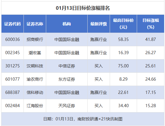 从券商推荐家数来看,1月13日有18家上市公司得到券商推荐,其中潮宏基获得2家推荐,渝农商行 (601077)、新集能源(601918)等获得1家推荐。 南财投研通数据显示,1月13日,券商给予上市公司目标价共6次,按最新收盘价计算,目标价涨幅排名 居前的公司有招商银行(600036)、潮宏基(002345)、汉朔科技(301275),目标价涨幅分别为 41.87%、26.27%、25.61%,分别属于股份制银行、饰品、其他电子行业。 | | | 01月13日目标价涨幅排名 | | | | | --- | --- | --- | --- | --- | --- | | 班学代码 | 证券名称 | 机构 | 最新评级 | 霞宫目牺价 E | 目标涨幅 (%) | | 600036 | 指南银行 | 中国国际金融 | 跑赢行业 | 58.35 | 41.87 | | 002345 | 潮宏基 | 中国国际金融 | 跑赢行业 | 16.39 | 26.27 | | 301275 | 汉朔科技 | 中信证券 | 买人 | 75.00 | 25.61 | | 601077 | 渝农商行 | 东方证券 | 买人 | 8. ...