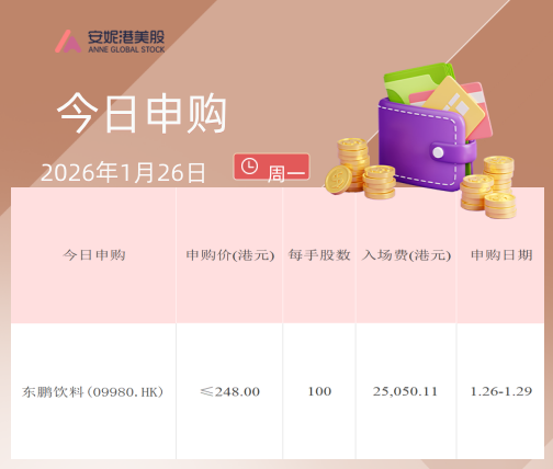 智通财经1月26日讯 利弗莫尔证券数据显示,今日港股新股资讯包括: 今起申购: 东鹏饮料(09980.HK) 2026年1月26日至2026年1月29日招股,该公司拟全球发售4088.99万股,其中香港发售占10%,国际发 售占90%,另有15%超额配股权,发售价将不高于每股发售股份248.00港元。每手100股,预期股份将于 2026年2月3日在联交所开始买卖。 有绿鞋机制,金额约15.21亿港元。 公司简介 东鹏饮料(集团)股份有限公司是中国功能饮料市场的领导者,以销量计,公司自2021年以来连续四年 稳居全国功能饮料产品首位。历经30余年深耕,公司持续为消费者提供高质价比的饮料产品,成功塑造 了备受消费者喜爱、拥有国民级影响力的"东鹏"品牌。 东鹏饮料AH股对比(更新至2026年01月26日 08:00) A股:最新价:253.36元/股,根据中国香港银行实时汇率计算得283.21港币/股;总市值:1,317.50亿元 H股:最高价:248.00港币/股;最高总市值:1663.93亿港币。 价格对比:A股比H股高35.21港币,即AH溢价率:+14.20%,HA折价率:-12.43% 保荐人分析 华泰金 ...
