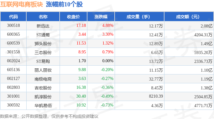 以上内容为证券之星据公开信息整理,由AI算法生成(网信算备310104345710301240019号),不构成投资建议。 从资金流向上来看,当日互联网电商板块主力资金净流入5342.02万元,游资资金净流出1770.51万元, 散户资金净流出3571.51万元。互联网电商板块个股资金流向见下表: 证券之星消息,11月13日互联网电商板块较上一交易日上涨2.28%,ST易购领涨。当日上证指数报收于 4029.5,上涨0.73%。深证成指报收于13476.52,上涨1.78%。互联网电商板块个股涨跌见下表: ...