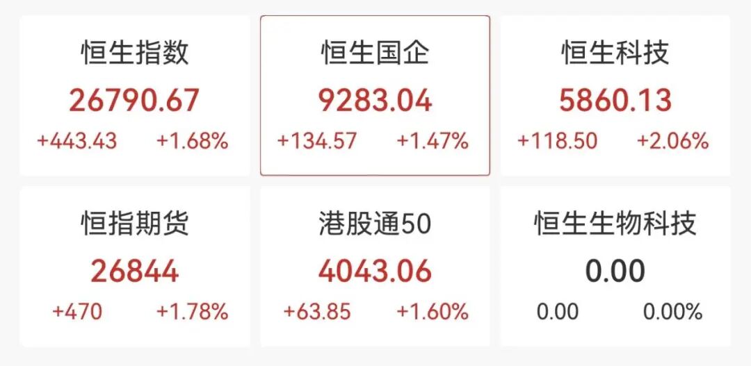 | 恒生指数 | 恒生国企 | 恒生科技 | | --- | --- | --- | | 26790.67 | 9283.04 | 5860.13 | | +443.43 +1.68% | +134.57 +1.47% | +118.50 +2.06% | | 恒指期货 | 港股通50 | 恒生生物科技 | | 26844 | 4043.06 | 0.00 | | +470 +1.78% | +63.85 +1.60% | 0.00 0.00% | | 名称 | 现价 | 涨跌幅 = | 总市们 三 | | --- | --- | --- | --- | | 京东健康 | 61.950 | 6.44% | 1988亿 | | 6618.HK | | | | | 商汤-W | 2.390 | 6.70% | 966亿 | | 0020.HK | | | | | 网易-S | 231.600 | 4.04% | 7337亿 | | 9999.HK | | | | | 小鹏汽车-W | 79.550 | 3.78% | 1521亿 | | 9868.HK | | | | | 哔哩哔哩-W | 217.800 | 3 ...