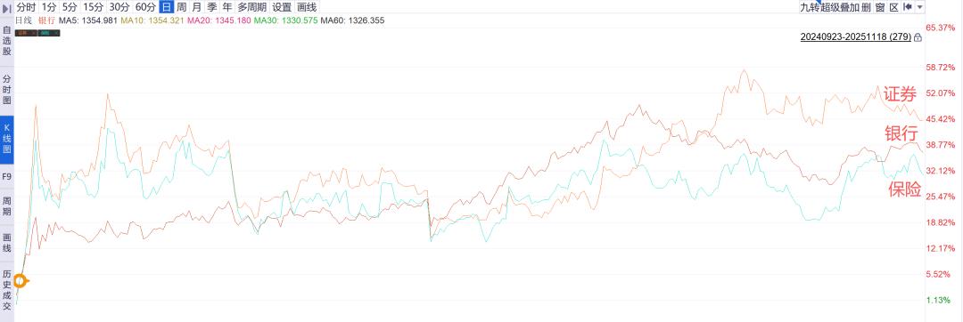 最近后台被问爆了:"明明是牛市,怎么手中券商股涨得磨磨唧唧,反倒银行保险一路飘红?慢牛格局下,啥时候券商股会再来行情?" 不少散户朋友盯着账户犯嘀咕,当初满仓券商盼着"牛市旗手"发力,结果看着隔壁农业银行接连创新高,心里那叫一个急。 先别慌着换仓,今天咱们把这事说透——券商不是涨得少,是前面冲得太猛,你刚好错过了它的"热身赛"。 所谓"券商涨不过银行保险",本质上是个"视觉误差"。 咱们先把尺子亮出来,用数据说话才靠谱。记住两个关键时间点:2024年9月24日,还有2025年4月7日的特朗普黄金坑,这都是本轮行情的两个重要起 点。 从2024年9月24日算起,到昨天券商板块整体涨幅超过47%,而银行板块超36%,保险板块略超33%。 再看2025年4月7日以来的这波反弹,券商也以14%的涨幅,跑赢了银行的9%和保险的5%,而需要注意的是这区间农业银行区间涨幅接近57%,远超其他 大金融个股,后面我们再会详细讲讲它的影响。 这么一看是不是很清晰?券商压根没输,甚至一直是"隐形冠军"。 先说稳定性,银行吃的是利息差,保险赚的是长期保费,不管市场涨跌,基本盘都不会大起大落。加上股息率常年稳定在3%-5%,就算行情调 ...