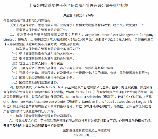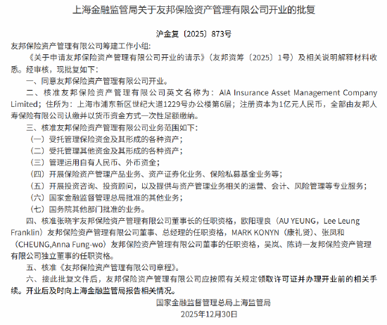 批复文件显示,友邦保险资管的注册资本为1亿元,荷全保险资管的注册资本为2.5亿元。 2025年6月,金融监管总局批准两家公司筹建,至上海金融监管局批复同意两家公司开业,仅用了半年 左右的时间,体现了"上海速度",彰显了上海全面推进金融高水平对外开放、持续优化营商环境的成 果。 两家公司穿透后均为外资全资控股。友邦保险资管的母公司友邦人寿保险有限公司是中国内地首家外资 独资人身险公司。其实控方——友邦保险集团逾百年前发源于上海,目前业务覆盖亚太18个市场。 荷全保险资管的发起方——荷兰全球人寿保险集团是一家拥有超过180年历史的国际金融服务集团,业 务网络覆盖全球多个国家和地区,为机构及个人客户提供长期的人寿保险、资产管理及退休解决方案。 转自:新华财经 友邦人寿董事长及友邦保险资管董事长张晓宇表示,中国持续推进高水平金融对外开放,为友邦保险资 管获批开业奠定了政策基础。随着国内保险资金规模不断扩大,人口老龄化加速带来养老投资需要,实 体经济对耐心资本的需求与日俱增,保险资管行业正迎来快速发展的机遇。 新华财经上海12月31日电(记者 王淑娟)记者31日获悉,上海金融监管局批复同意友邦保险资产管理 有限公司(下 ...
