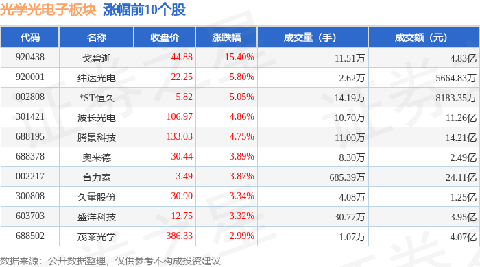 从资金流向上来看,当日光学光电子板块主力资金净流出4.89亿元,游资资金净流出2.03亿元,散户资金 净流入6.92亿元。光学光电子板块个股资金流向见下表: | 代码 | 名称 | 主力净流入(元) | 主力净占比 游资净流入 (元) | | 游资净占比 散户净流入(元) | | 散户净占比 | | --- | --- | --- | --- | --- | --- | --- | --- | | 002222 福晶科技 | | 1.15 Z | 9.80% | -1.03 Z | -8.72% | -1271.61万 | -1.08% | | 002273 水晶光电 | | 9536.33万 | 9.57% | -1.19 Z | -11.90% | 2324.05万 | 2.33% | | 000100 TCL科技 | | 8508.87万 | 4.71% | -7497.75万 | -4.15% | -- - 1011.12万 | -0.56% | | 301421 波长光电 | | 8336.05万 | 7.40% | -2400.71万 | -2.13% | -5935.35万 | -5.27% | ...