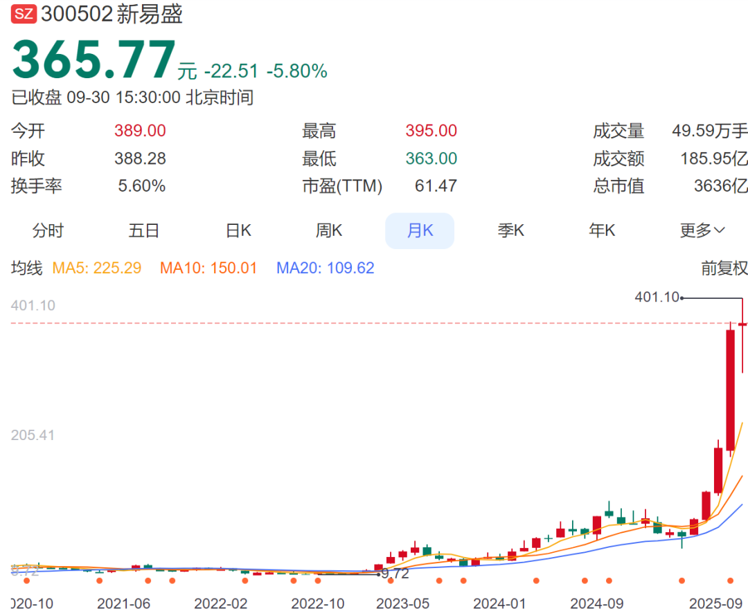 每经记者|蔡鼎 每经编辑|陈柯名 董兴生 中际旭创公布控股股东不超过550万股的减持计划过去还不到一周,另一家A股光模块焦点公司也发布了大股东减持计划。 9月30日晚间,新易盛(300502.SZ,股价365.77元,市值3635.65亿元)公告称,公司控股股东及实控人之一、董事长高光荣计划通过询价转让方式转让 1143.07万股,占公司总股本的1.15%。本次询价转让不存在可能导致公司控制权变更的情形。 值得注意的是,按照30日新易盛收盘价365.77元/股计算,高光荣本次减持股份市值达41.8亿元。 此外,自今年4月以来,新易盛累计涨幅超过630%。 公告显示,高光荣承诺所持股份已解除限售,权属清晰,且自本次询价转让完成后12个月内不通过二级市场方式减持公司股份。转让价格下限不低于发送 认购邀请书之日前20个交易日股票交易均价的70%。 董事长称减持所得主要用于 支持前沿科技投资 截至公告披露日,高光荣持有新易盛约7344.54万股,占公司总股本比例为7.39%。而除控股股东及实控人之一身份外,高光荣还是新易盛董事长。 据公告,高光荣此次询价转让股份的原因为自身资金需求,且公告明确称,"主要用于支持新质生 ...