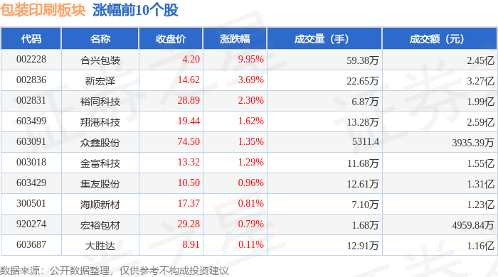 Market Overview - The packaging and printing sector experienced a decline of 1.09% on November 19, with Yinglian Co., Ltd. leading the losses [1] - The Shanghai Composite Index closed at 3946.74, up 0.18%, while the Shenzhen Component Index closed at 13080.09, unchanged [1] Stock Performance - Hexion Packaging (002228) saw a significant increase of 9.95%, closing at 4.20, with a trading volume of 593,800 shares and a turnover of 245 million yuan [1] - Yinglian Co., Ltd. (002846) led the decline with a drop of 9.09%, closing at 18.91, with a trading volume of 350,900 shares and a turnover of 681 million yuan [2] - Other notable performers included Xinhongze (002836) with a 3.69% increase and Yutong Technology (002831) with a 2.30% increase [1][2] Capital Flow - The packaging and printing sector saw a net outflow of 206 million yuan from institutional investors, while retail investors contributed a net inflow of 184 million yuan [2] - The capital flow data indicates that Hexion Packaging had a net inflow of 133 million yuan from institutional investors, while retail investors showed a net outflow of 59 million yuan [3] Summary of Key Stocks - Hexion Packaging (002228) had a strong performance with a net inflow of 133 million yuan from institutional investors, but faced a net outflow from retail investors [3] - Yinglian Co., Ltd. (002846) experienced significant selling pressure, leading to a 9.09% decline in its stock price [2] - Other stocks like Xinhongze (002836) and Jinfutech (003018) also showed mixed capital flows, with varying levels of institutional and retail investor interest [3]