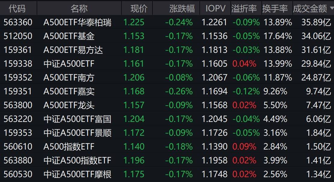 截至上午收盘,场内跟踪中证A500指数的ETF小幅下跌。其中,有12只中证A500相关ETF成交额超1亿元,3只超31亿元。A500ETF华泰柏瑞、A500ETF基 金、A500ETF易方达早盘成交额分别为35.89亿元、34.06亿元、31.61亿元。 | 有券商表示,短期内,由于A股自身运行逻辑未发生根本改变,海外市场对大盘影响相对有限,叠加上证指数在4000点附近震荡消化多时,指数层面下探空 | | --- | | 间也相对有限,市场连续调整到位后可适当逢低布局。 | 每日经济新闻 市场早间冲高回落,深成指、沪指先后翻绿,中证A500指数下跌0.01%。 盘面上,军工板块表现活跃,银行板块走强,化工板块盘中拉升。下跌方面,影视、传媒板块走弱。 | 代码 | 名称 | 现价 | 涨跌幅 | IOPV 溢折率 筷号率 成交金额 | | | --- | --- | --- | --- | --- | --- | | 563360 | A500ETF华泰柏瑞 | 1.225 | -0.24% | 1.2261 -0.09% 13.89% | 35.89 Z | | 512050 | A500ETF基金 | 1. ...