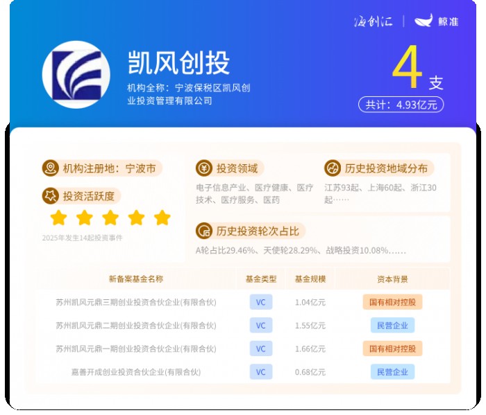 免责声明 2025年12月,一级市场募资迎来年末收官高潮,热度较11月持续升级。从募资端来看,市场呈现翘尾爆 发态势,量价均创纪录,结构上股权投资基金主导增长,区域格局呈现江浙领跑与头部省份集中的特 征,国资与头部机构共同发力,大额基金聚焦战略新兴产业与科创赛道,募资格局进一步优化。 电子信息产业、医疗健康、医疗技术、医疗服务、医药的早期创业者需重点关注凯风创投: 鲸准数据显示:凯风创投成立于2017年2月21日,注册地址位于宁波市,基本定位于TMT和Healthcare的 天使和早期投资,投资领域主要为电子信息产业、医疗健康、医疗技术、医疗服务、医药。2025年12月 凯风创投备案4支基金,皆为创业投资基金,基金规模约为4.93亿元,备案的4支基金中2支的资本背景 为国有相对控股,2支的资本背景为民营企业。凯风创投2025年共发生14起投资事件,投资活动活跃。 其过往的投资案例中A轮占比29.46%、天使轮占比28.29%、战略投资占比10.08%。在其过往投资案例的 地域分布中,江苏占93起,上海占60起,浙江占30起…… 1. 本募资月报(以下简称"报告")所涉2025年12月基金备案数据均来源于中国证 ...