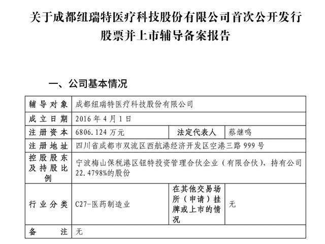 | 辅导对象 | 成都纽瑞特医疗科技股份有限公司 | | --- | --- | | 成立日期 | 2016年4月1日 | | 注册资本 | 6806. 124 万元 法定代表人 蔡继鸣 | | 注册地址 | 四川省成都市双流区西航港经济开发区空港三路 999号 | | 控 股 股东 及持股比 伊 | 宁波梅山保税港区钮特投资管理合伙企业(有限合伙),持有公司 22. 4798%的股份 | | 行业分类 | 在其他交易场 所(申请)挂 C27-医药制造业 无 牌或上市的情 况 | | 注 | 无 | 瑞财经 刘治颖 1月29日,成都纽瑞特医疗科技股份有限公司(以下简称:纽瑞特医疗)在四川证监局完 成IPO辅导备案,拟A股上市,辅导机构为国泰海通证券股份有限公司。 纽瑞特医疗成立于2016年4月,法定代表人为蔡继鸣,注册资本为6806.12万元,致力于医用同位素和放 射性药品的创新研发、生产及商业化。 公司在研多款创新产品。包括钇[90Y]炭微球注射液、核素偶联生物单抗/ 多肽等产品。主要用于诊断和 治疗肝癌、胰腺癌、淋巴癌、甲状腺癌、前列腺癌、肺癌等高发癌症。 纽瑞特医疗控股股东为宁波梅山保税港区钮特投资管理 ...