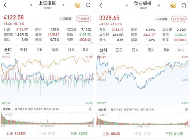 建筑材料领涨,有色金属跌幅靠前 在板块方面,建筑材料领涨两市,科顺股份(300737)、金隅集团(601992)、万里石(002785)、九 鼎新材(002201)、宏和科技(603256)、再升科技(603601)等涨停或涨超10%。 石油石化全天强势,洲际油气(600759)、蓝焰控股(000968)、润贝航科(001316)、仁智股份 (002629)等涨停,石化油服(600871)一度涨停,潜能恒信(300191)、中曼石油(603519)等涨超 7%。 国防军工涨幅居前,三角防务(300775)、爱乐达(300696)、钢研高纳(300034)、北摩高科 (002985)、航发科技(600391)、银河电子(002519)等涨停或涨超10%。 至收盘,上证综指涨0.14%,报4122.58点;科创50指数涨0.41%,报1541.64点;深证成指涨0.5%,报 14327.05点;创业板指涨1.01%,报3328.65点。 Wind统计显示,两市及北交所共3576只股票上涨,1774只股票下跌,平盘有120只股票。 沪深两市成交总额26918亿元,较前一交易日的26006亿元增加912亿元。其中,沪 ...