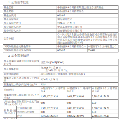| 2 基金募集情况 | | | | | | --- | --- | --- | --- | --- | | 基金要集申请获中国证监会核准 | | 证监许可[2025]2820号 | | | | 的文号 | | | | | | 基金最集期间 | | 白2026年1月26日 | | | | | | 全2026年1月26日止 | | | | 哈资机构名称 | | 毕马威华振会计师事务所(特殊普通合伙) | | | | 慕集资金划人基金托管专户的日 | | 2026年1月28日 | | | | 10 | | | | | | 慕集有效认购总户数(单位;户) | | 7005 | | | | 份额类别 | | 中银招享6个月持有泥 中银招享6个月持有 | | 中银招享6个月持有准 | | | | 合A | 图合C | 合合计 | | 豪集期间净认购金额(单位;人民 | | 1.379.607.523.33 | 1,008,727,650,96 | 2.388.335.174.29 | | 而元) | | | | | | 认购资金在要集期间产生的利息 | | 0.00 | 0.00 | 0.00 | | (单位:人民币元 ...