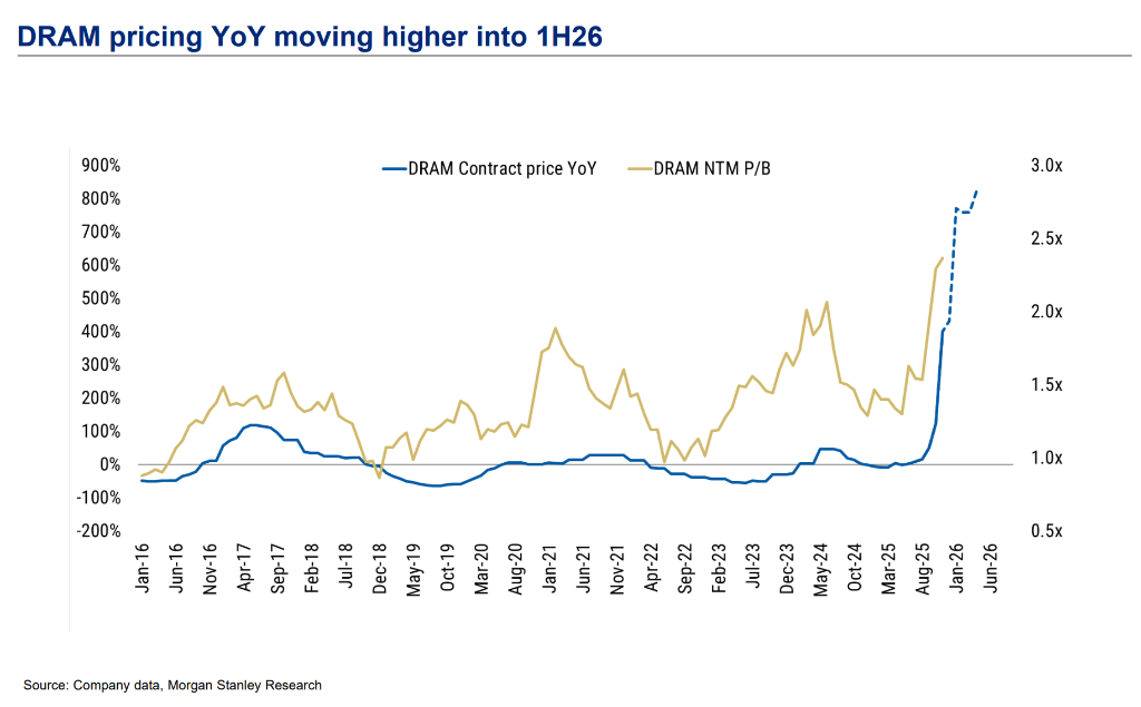 人工智能浪潮正在重塑半导体行业的估值逻辑,随着AI驱动的需求爆发,存储芯片市场正经历一场显著的分化。 据追风交易台,摩根士丹利1月20日发布的研报显示,在2026年上半年,DRAM(动态随机存取存储器)价格同比持续走高,但这并非一场"雨露 均沾"的盛宴。市场正迅速划分为两大阵营:受益于AI推理和高性能计算需求的"赢家",以及受制于宏观逆风与成本通胀的"输家"。 大摩分析,AI带来的技术通胀正在加剧供应链的成本压力,导致存储芯片与传统硬件制造商之间的"贫富差距"拉大。分析师指出,AI不仅推动了 对HBM(高带宽存储器)和企业级SSD的强劲需求,甚至导致DDR4等传统存储产品也出现持续短缺。然而,这种上游存储成本的上涨,对于下 游PC和智能手机OEM厂商而言,正演变为严峻的利润阻力。 在这场"K型"复苏中,投资者应高度关注那些处于AI供应链核心位置的企业。大摩明确将SK海力士、三星以及闪迪公司等列为"最受青睐"的标 的,理由是它们直接受益于AI驱动的大宗商品周期和NAND超级周期。相反,对于无法将上涨的存储成本转嫁给消费者的传统PC外设和OEM厂 商,如宏碁和罗技,市场前景则依然承压。 这一趋势的核心逻辑在于AI ...