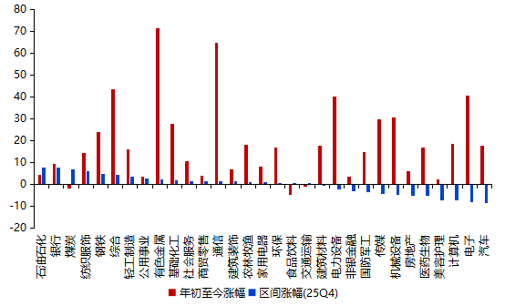注:数据来源iFind,统计区间2025/1/1—2025/11/30,此处采用申万一级行业;历史过往仅供参考,不 预示未来表现。 随着2025年A股行情收官在即,市场对2026年的投资布局关注度持续升温。 年初至今有色、TMT、电力设备表现较好,而红利板块与地产链则相对承压。在复杂的内外部环境 下,明年市场能否延续活跃?哪些领域将孕育新的投资机会?成为当前投资者关注的焦点。 2025年第四季度中国股市各行业阶段性表现 1.AI超级周期:国内外算力链条景气延续,关注新技术迭代相关领域以及通胀环节,应用端关注游戏 行业确定性成长,智能终端和AI应用行情或将逐步展开。 此外,资金面一直是影响A股走势的关键变量。以"A股自由流通市值/居民存款余额"与指数回归残差衡 量居民资产配置迁移程度,可见2021年为上一轮配置高点,2022—2024年进入调整期,2025年初步见底 回升。目前该指标仍处于历史低位,显示资金向权益市场迁移的过程才刚刚开始,未来仍有空间。此 外,保险资金、银行理财等机构投资者在2026年有望成为重要的边际增量资金来源,进一步夯实市场流 动性基础。 2.高端制造出海:关注储能—锂电、AI缺电相关高景 ...