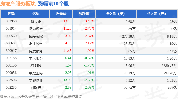 证券之星消息,1月14日房地产服务板块较上一交易日上涨1.32%,宁波富达领涨。当日上证指数报收于 4126.09,下跌0.31%。深证成指报收于14248.6,上涨0.56%。房地产服务板块个股涨跌见下表: | 代码 | 名称 | 收盘价 | 涨跌幅 | 成交量(手) | 成交额(元) | | --- | --- | --- | --- | --- | --- | | 002188 | 中天服务 | 6.45 | -1.83% | 27.14万 | 1.76亿 | | 000056 | 皇庭国际 | 2.09 | -1.42% | 46.95万 | 9897.04万 | | 001914 | 招商积余 | 10.98 | -1.35% | 10.99万 | 1.22亿 | | 002285 | 世联行 | 2.97 | -1.00% | 114.32万 | 3.42亿 | | 600136 | ST明诚 | 1.70 | -0.58% | 24.29万 | 4137.33万 | | 000560 | 我爱我家 | 2.95 | -0.34% | 148.03万 | 4.38亿 | | 300917 | 特发 ...