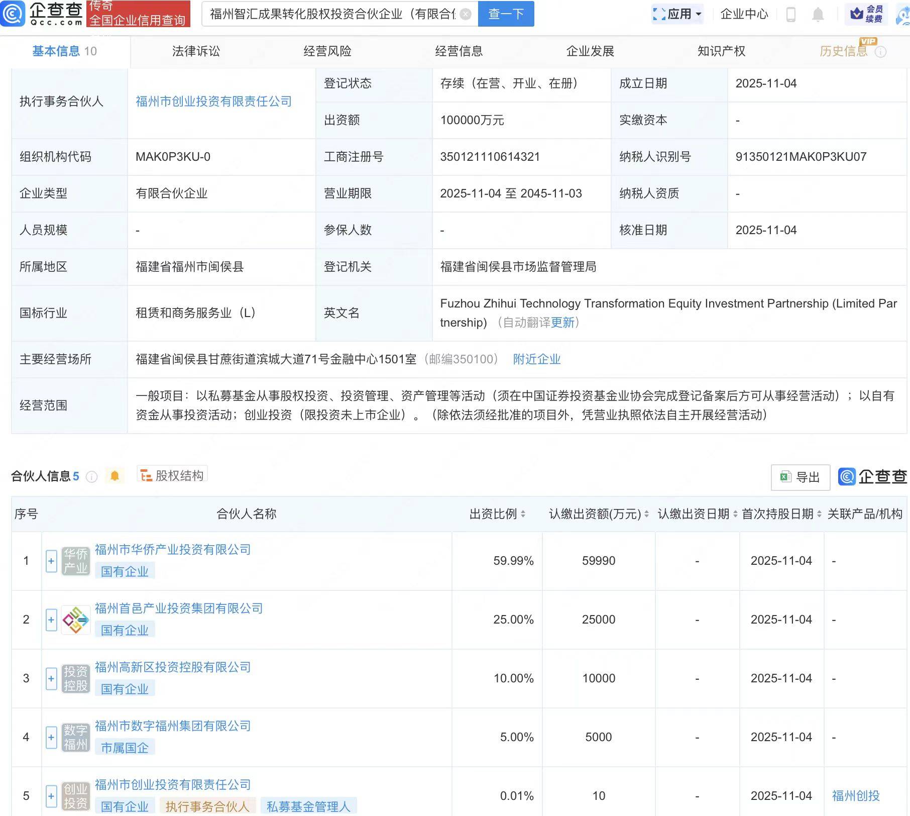 | LAG R R R 全国企业信用查询 | | 福州智汇成果转化股权投资合伙企业(有限合1 | 苔一下 | | --- | --- | --- | --- | | 基本信息 10 | 法律诉讼 | 经营风险 | 经营信息 | | 执行事务合伙人 | 福州市创业投资有限责任公司 | 登记状态 | 存续(在营、开业、 | | | | 出资额 | 100000万元 | | 组织机构代码 | МАКОРЗКИ-0 | 工商注册号 | 350121110614321 | | 企业类型 | 有限合伙企业 | 营业期限 | 2025-11-04 至 2045- | | 人员规模 | | 参保人数 | | | 所属地区 | 福建省福州市闽侯县 | 登记机关 | 福建省闽侯县市场监 | | 国标行业 | 相赁和商务服务业(L) | 英文名 | Fuzhou Zhihui Techn | | | | | tnership) (自动翻译 | | 主要经营场所 | 福建省闽侯县甘蔗街道滨城大道71号金融中心1501室(邮编350100) 附近企 | | | | 经营范围 | 般项目:以私募基金从事股权投资、投资管理、资产管理等活动 ...