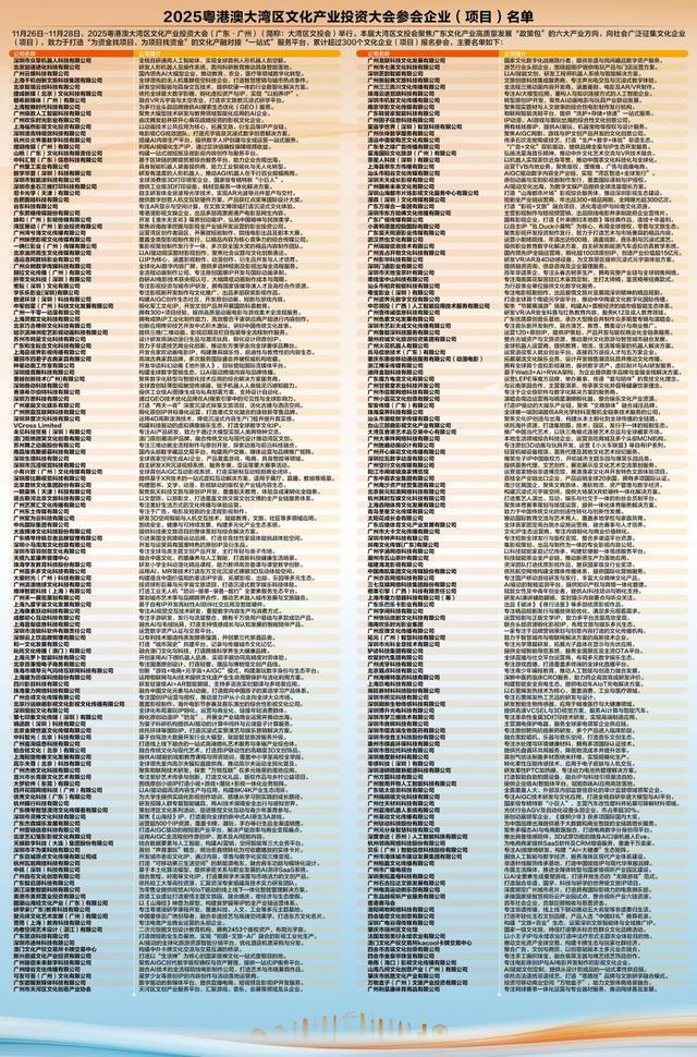 近年来,《黑神话:悟空》《哪吒之魔童闹海》等持续火爆出圈,并且产生裂变效应、长尾效应,充分 展现了文化产业的发展潜力。作为中国文化产业第一大省,广东依托深厚的历史文化底蕴、活跃的市场 环境和完善的产业体系,抢先布局,开辟更多文化新业态、新赛道,文化产业规模总量连续22年居全国 首位,在数字创意、动漫游戏、网络视听、数字文化制造等领域已建立起显著竞争优势。 (原标题:粤燃粤旺!文化强省"出圈"又"破圈",这波实力藏不住了) 文化"粤"动,向新图强。敢为天下先的广东,又一次站在了潮头之上。 2025粤港澳大湾区文化产业投资大会(下称"大湾区文投会")将于11月26日至28日举行。本届大会紧密 结合近期出台的广东新一轮推动文化产业高质量发展"政策包"六大产业方向,着力助推广东文化新业态 实现关键突破。 作为湾区文化产业领域的重要盛会,大湾区文投会此前已成功举办两届,累计58个路演项目中,有28个 在会上及会后一年内成功获得融资,转化率约50%,实际融资超过95亿元。 ...