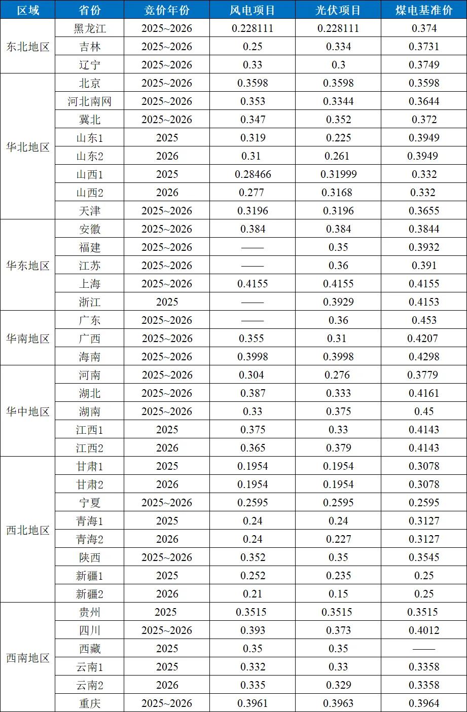 截至 2026 年 2 月 22 日,全国 31 个省(区、市)均已开展至少一轮新能源机制电价竞价工作。整体情况如下: 1、山东、山西、江西、甘肃、新疆、青海、云南等 7 个省份,对 2025 年下半年及 2026 年项目分两批开展竞价出清,全国累计形成 38 个竞价出清结果。 2、浙江、贵州两省 2026 年度新能源机制电价竞价工作暂未完成出清。 3、全国 31 个省份均有光伏项目参与并完成出清;其中福建、江苏、广东及浙江(2025 年批次)出清结果中不含风电项目,实际共有 27 个省份完成风电 项目竞价出清。 31省、38次出清结果如下表所示: | 区域 | 复 保 | 竞价年份 | 风电项目 | 光伏项目 | 煤电基准价 | | --- | --- | --- | --- | --- | --- | | 东北地区 | 黑龙江 | 2025~2026 | 0.228111 | 0.228111 | 0.374 | | | 吉林 | 2025~2026 | 0.25 | 0.334 | 0.3731 | | | 辽宁 | 2025~2026 | 0.33 | 0.3 0.3598 | 0.3749 | | ...