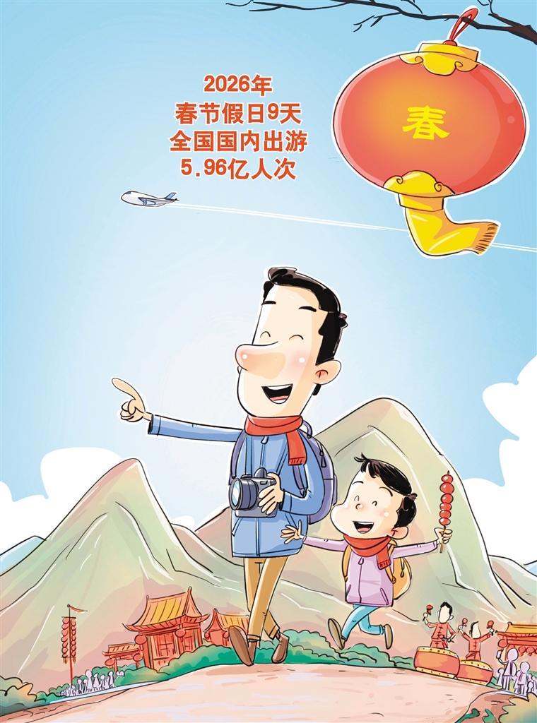 王 鹏作(新华社发) 近日,文化和旅游部公布2026年春节假期文化和旅游市场情况。春节假日9天,全国国内出游5.96亿人次, 较2025年春节假日8天增加0.95亿人次;国内出游总花费8034.83亿元,较2025年春节假日8天增加1264.81亿 元,假日游客人数和花费均创历史新高。这份亮眼的成绩单,勾勒出文旅市场下一步的着力方向。相关部门 应持续优化消费环境,完善交通、住宿等基础设施配套,并针对入境游进一步优化签证通关、支付服务等便 利化措施;文旅企业需深耕"文化+",将非遗、民俗与传统节日深度融合,打造更多沉浸式、高品质的体验 项目。各地要立足资源禀赋,推动冰雪、避寒、乡村等特色旅游差异化发展,将假日流量转化为高质量发展 的持久增量,让文旅市场的热力持续升腾。(时 锋) ...