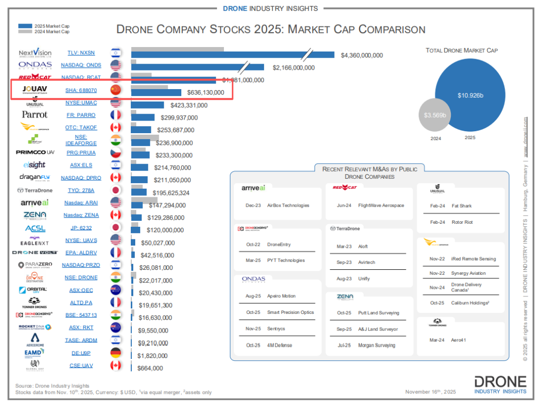 近日,纵横股份(688070)官微消息显示,国际权威无人机行业研究机构德国Drone Industry Insights(Droneii)于近期发布了2025年度全球无人机上市公司 市值排名。纵横股份成功跻身全球无人机上市公司市值排名TOP4,为此次榜单中唯一上榜的中国企业。 图片来源:纵横股份官微 据了解,Droneii的报告以其独立性、全球视野和严谨的分析框架而著称,是全球无人机产业投资与趋势判断的重要风向标。本次市值排名,不仅反映了 投资者对纵横股份技术路径、商业模式及在工业无人机赛道长期成长性的看好,也凸显了全球市场对以纵横股份为代表的中国高端工业无人机品牌价值的 重估。 作为国内工业无人机领域的领军企业,纵横股份拥有全谱系工业无人机,并结合大数据、人工智能、AI的发展,为智慧政务和行业应用提供低空AI数字 化整体解决方案。 公司深刻洞察行业用户核心需求,以"无人值守系统+云平台+AI"为核心架构,助力电力巡检、国土测绘、环保监测、城市管理、应急救灾、水利等行 业。以精准、可靠、高效的空中数据采集与解决方案,持续赋能千行百业的数字化转型与智能化升级。公司在浙江绍兴、四川巴中、四川彭州、重庆梁平 等多地 ...