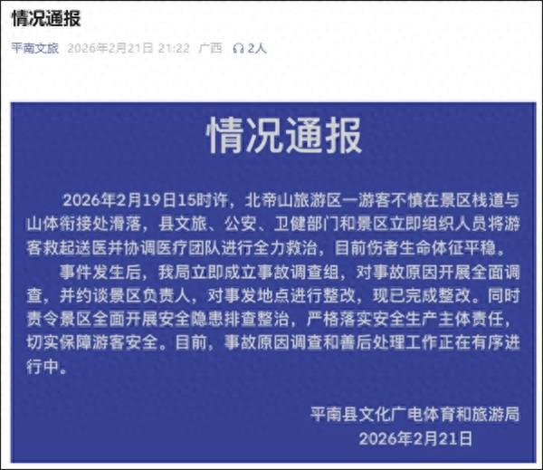 2月21日,广西省贵港市平南县文化广电体育和旅游局发布情况通报: 据南国早报此前报道,2月19日下午,贵港市平南县北帝山景区发生一起事故,一名10岁男孩在悬崖栈 道游玩时,不慎从栈道与山体间一处空洞跌落,跌至崖下。景区与救援人员紧急搜救,将孩子找到并紧 急送医救治。 2026年2月19日15时许,北帝山旅游区一游客不慎在景区栈道与山体衔接处滑落,县文旅、公安、卫健 部门和景区立即组织人员将游客救起送医并协调医疗团队进行全力救治,目前伤者生命体征平稳。 事件发生后,我局立即成立事故调查组,对事故原因开展全面调查,并约谈景区负责人,对事发地点进 行整改,现已完成整改。同时责令景区全面开展安全隐患排查整治,严格落实安全生产主体责任,切实 保障游客安全。目前,事故原因调查和善后处理工作正在有序进行中。 来源:平南文旅 ...