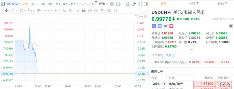 人民币继续走强! 今日(12月25日),离岸人民币兑美元升破7.0大关,最高触及6.99709,续创2024年9月30日以来新高;在岸人民币兑美元升破7.01关 口,一度升至7.0058,突破了2024年9月27日的前高(7.0106),创2023年5月22日以来新高。 东吴证券指出,2025年可能标志着人民币贬值周期的终结,新一轮升值周期已然开启,预计2026年底人民币兑美元汇率可能触及6.70- 6.80区间。 德意志银行、瑞银等外资机构也预测,2026年人民币汇率有望稳步升至6.7左右,长期甚至可能向6.40-6.50区间迈进 ;摩根士丹利则预测 2026年底人民币兑美元汇率约为7.05,区间内偏弱运行,但整体仍维持升值预期。 利好哪些产业? 分析指出,人民币稳步升值有望吸引全球资本逐步增配中国资产(A/H股)。 南华期货研报指出,2025年下半年,人民币兑美元汇率展现出显著的强势特征,其升值步伐在第四季度尤为加快,呈现出与美元指数阶 段性走强相背离的内生性上涨态势。 整体来看,此轮升值可以归结为三大核心支柱:在"弱美元"大环境下的被动升值、由人民币资产吸引力提升引发的主动升值,以及政策 预期稳定与季节 ...