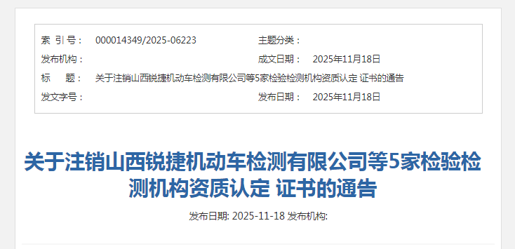 中国质量新闻网讯 据山西省市场监督管理局网站消息,近日,山西省市场监督管理局发布关于注销山西 锐捷机动车检测有限公司等5家检验检测机构资质认定证书的通告。 依照《检验检测机构资质认定管理办法》(市场监管总局第163号令),山西省市场监督管理局决定对 山西锐捷机动车检测有限公司等5家检验检测机构资质认定证书予以注销,特此通告。 山西省市场监督管理局 2025年11月17日 注销检验检测机构资质认定证书的机构名单 | 序号 | 机构名称 | 证书编号 | 有效期至 | 注销原因 | | --- | --- | --- | --- | --- | | 1 | 山西锐捷机动车检测有限公司 | 220405340940 | 2028-08-03 | 机构申请注销 | | 2 | 太原市宝泰成建筑工程检测有限公司 | 230401060668 | 2029-09-18 | 机构申请注销 | | 3 | 城区生态环境监测监控站 | 220412050166 | 2028-01-13 | 机构申请注销 | | 4 | 山西华羽盛泰科技有限公司 | 190401060805 | 2025-07-15 | 机构申请注销 | | ...