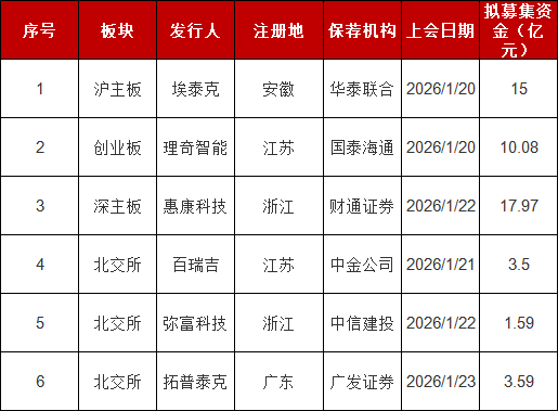 惠康科技主营业务为制冷设备的研发、生产及销售为核心业务。 1家创业板公司拟上会 理奇智能专注于物料自动配料、分散乳化、混合搅拌等物料自动化处理领域,提供专业的物料智能处理 系统整体解决方案。 证券时报·数据宝统计,根据深交所、上交所、北交所上市委会议公告,本周(1月19日—1月23日)将 有6家企业首发事项上会。 从拟上市板来看,惠康科技拟登陆深市主板;埃泰克拟沪市主板上市;理奇智能拟创业板IPO;拓普泰 克、弥富科技等3家企业拟北交所IPO。 拟募资额方面,本周即将上会的6家企业中,拟募集资金最多的是惠康科技,预计募集资金17.97亿元, 募资拟投向前湾二号制冷设备智能制造生产基地建设项目、制冷设备生产基地智能化升级改造项目、研 发中心建设项目、泰国制冷设备智能制造生产基地项目等项目。其次是埃泰克、理奇智能,拟募资金额 分别为15.00亿元、10.08亿元。地域分布看,本周即将上会企业中,江苏省有2家企业上榜,浙江省有2 家企业上榜,安徽省、广东省分别有1家企业上榜。 2家主板公司拟上会 埃泰克主要从事汽车电子产品的研发、生产及销售。 弥富科技专注从事汽车流体管路系统关键零部件以及导轨、护板等其他塑料零部件 ...