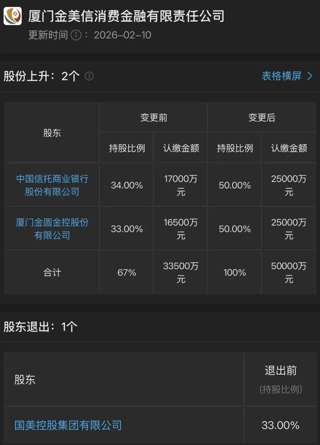 | 股东 | 变更前 | | 变更后 | | | --- | --- | --- | --- | --- | | | 持股比例 | 认缴金额 | 持股比例 | 认缴金额 | | 中国信托商业银行 | 34.00% | 17000万 | 50.00% | 25000万 | | 股份有限公司 | | 元 | | 元 | | 厦门金圆金控股份 | 33.00% | 16500万 | 50.00% | 25000万 | | 有限公司 | | 元 | | 元 | | 合计 | 67% | 33500万 | 100% | 50000万 | | | | 元 | | 元 | 来源:消金界 近日,企查查工商变更信息显示,厦门金美信消费金融有限责任公司完成重大股权调整,这家两岸合资持牌消金机构的股权格局彻底改写,也为行业中小 机构适配严监管提供了典型样本。 企查查信息 本次变更前,金美信消金采用中国信托商业银行(34%)、厦门金圆金控(33%)、国美控股(33%)的三方均衡持股结构,注册资本5亿元,三方认缴金 额分别为1.7亿元、1.65亿元、1.65亿元。变更后,国美控股完全退出,股东精简为两家:中国信托商业银行持股比例升至5 ...