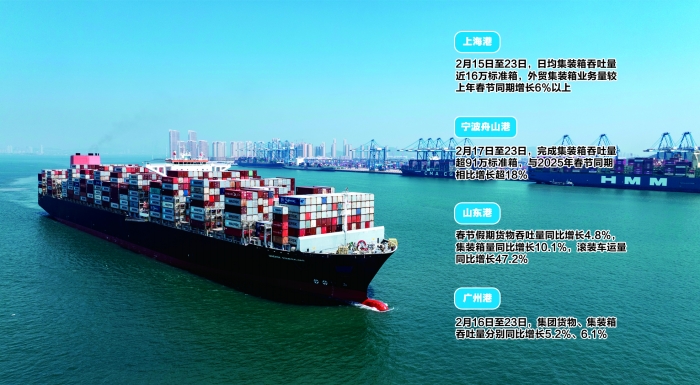 郭晨凯 制图 ◎记者 陈梦娜 码头吊臂挥舞,巨轮穿梭不停歇,集疏运体系有效运转……这是多地"春节不打烊"港口的繁忙景象。 春节假期,不少上市港口企业提前谋划、科学调度,用高效的物流服务保障产业链供应链稳定畅通。节 后开工即冲刺,港口企业全力推动业务迈上新台阶,尽显港口经济的强劲活力。 港口春节假期成绩喜人 全国港口企业春节假期生产全线飘红,交出一份成色十足的"成绩单"。 广州港同样捷报频传,外贸活力持续释放。2月16日至23日,广州港集团货物、集装箱吞吐量分别同比 增长5.2%、6.1%。 智慧赋能 港口运转高效畅通 春节假期,面对船舶集中到港、恶劣天气等多重考验,港口企业依托智慧港口建设成果,以科学调度、 智能管控实现高效运转。 保船期、畅通道成为港口企业的共识。据介绍,日照港集装箱分公司充分发挥智能化管控系统和自动化 设备优势,集装箱船舶作业艘次同比提升77.4%。在日照港大宗干散货智慧绿色作业区,创新应用无人 驾驶电动机车、翻车机自动摘钩、火车自动清车等技术成果,打造了全货类适用、全流程互通、全系统 智能的大宗干散货作业体系。 春节假期,宁波舟山港装卸作业24小时不间断,生产热潮涌动。宁波港相关负责人对 ...