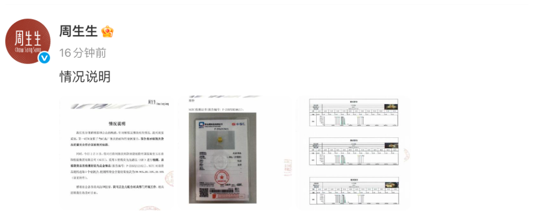 周生生刚刚公布检测报告:同批次同款福袋检测为足金