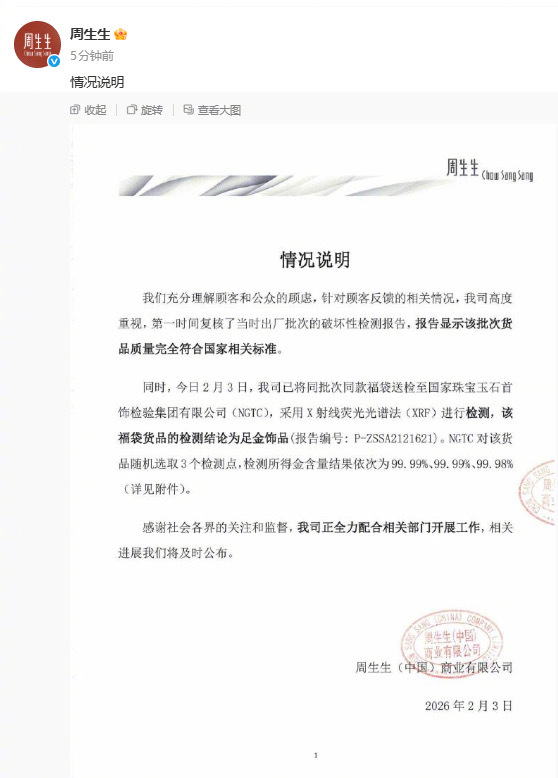每经编辑|程鹏 2月3日,周生生发布情况说明: 我们充分理解顾客和公众的顾虑,针对顾客反馈的相关情况,我司高度重视,第一时间复核了当时出厂批次的破坏性检测报告,报告显示该批次货品质量 完全符合国家相关标准。 同时,今日2月3日,我司已将同批次同款福袋送检至国家珠宝玉石首饰检验集团有限公司(NGTC),采用X射线荧光光谱法(XRF)进行检测,该福袋货品的 检测结论为足金饰品(报告编号:P-ZSSA2121621)。NGTC对该货品随机选取3个检测点,检测所得金含量结果依次为99.99%、99.99%、99.98%(详见附件)。 感谢社会各界的关注和监督,我司正全力配合相关部门开展工作,相关进展我们将及时公布。 情况说明 我们充分理解顾客和公众的顾虑,针对顾客反馈的相关情况,我司高度 重视,第一时间复核了当时出厂批次的破坏性检测报告,报告显示该批次货 品质量完全符合国家相关标准。 感谢社会各界的关注和监督,我司正全力配合相关部门开展工作,相关 进展我们将及时公布。 t业有限公司 周生生(中国)商业有限公司 2026年2月3日 周生生 <how Sang Sang NGTC 检测证书(报告编号:P-ZSSA2121 ...