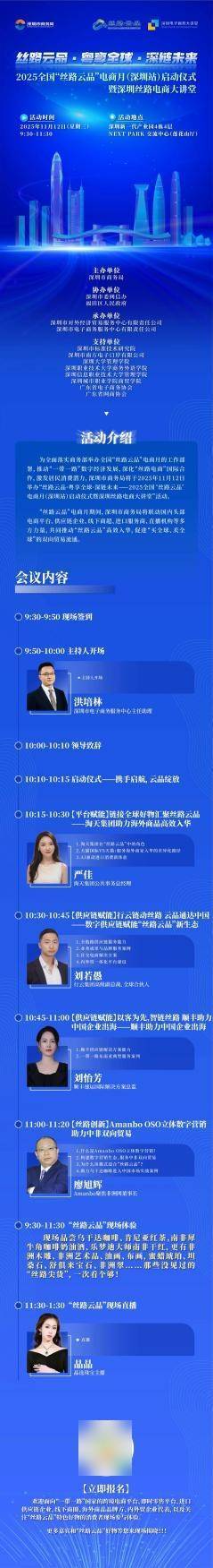 Core Viewpoint - The Shenzhen Municipal Bureau of Commerce is organizing the "Silk Road Cloud Products" e-commerce month event in November 2025 to promote digital economy development along the Belt and Road initiative and enhance international cooperation in e-commerce [1] Group 1: Event Overview - The "Silk Road Cloud Products" e-commerce month (Shenzhen Station) will take place in November 2025, aligning with the Ministry of Commerce's national deployment [1] - The event aims to facilitate efficient connections between "Silk Road Cloud Products" and the Shenzhen market, supporting two-way trade under the theme of "buy global, sell global" [1] Group 2: Event Activities - The launch ceremony and Shenzhen Silk Road E-commerce Lecture Hall will be held on November 12 at the Shenzhen New Generation Industrial Park [1] - The event is organized by the Shenzhen Municipal Bureau of Commerce, with support from various governmental and professional institutions, aiming to gather resources, industry experts, and quality products [1] Group 3: Objectives - The event seeks to create a comprehensive e-commerce experience that includes policy interpretation, platform empowerment, supply chain connections, and showcasing quality products from the Silk Road [1]