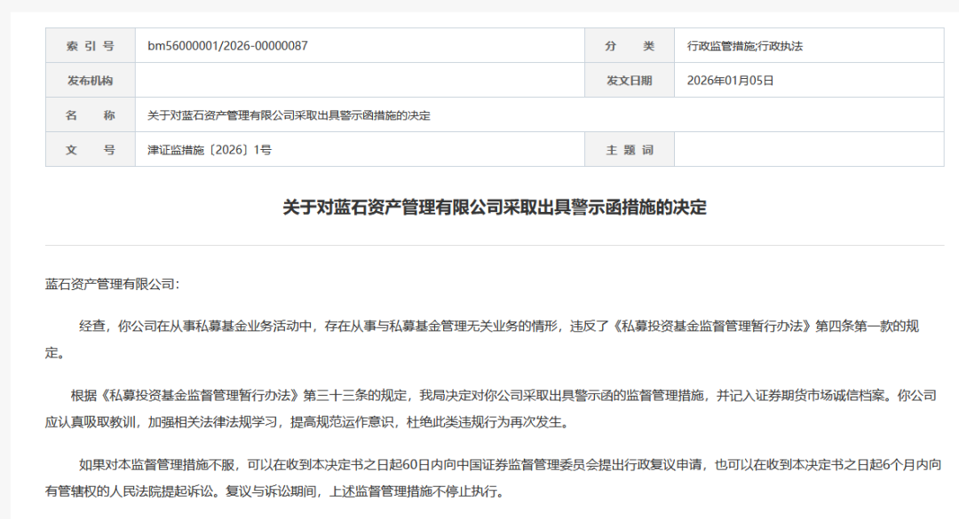 昔日百亿级私募,2026年开年便被警示,怎么回事? 近日,天津证监局发布行政监管措施公告称,蓝石资产管理有限公司(简称"蓝石资产")因"不务正业"被采取出具警示函的监管措施。据公开资料,蓝石 资产为昔日知名百亿级债券私募,但2019年以来其持有的债券陆续出现逾期风险,诉讼不断,去年蓝石资产法定代表人李九如更是将变更公司登记一事诉 诸公堂。中国证券投资基金业协会(简称"中基协")公示信息显示,蓝石资产目前规模已经缩水至10亿元以下。 在多位业内人士看来,伴随着监管不断细化,私募业优胜劣汰将进一步加速,尤其是以往凭借灰色操作躺赢,不具备专业投资能力的管理人会逐步退出历 史舞台,取而代之的是以投资者利益为先,投研能力领先,合规风控体系完善的私募。 蓝石资产被出具警示函 2026年1月4日,天津证监局发布行政监管措施公告称,经查实,蓝石资产在开展私募基金业务期间,存在从事与私募基金管理无关业务的行为。该行为违 反了《私募投资基金监督管理暂行办法》第四条第一款关于"私募基金管理人应当遵循专业化运营原则,主营业务清晰,不得兼营与私募基金管理无关或 存在利益冲突的其他业务"的规定。 因此,天津证监局决定对蓝石资产采取出具警 ...