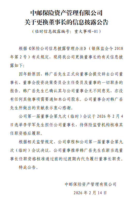 2月24日金融一线消息,近日,中邮资管发布公告称,因年龄原因,韩广岳正式向董事会提交辞去公司 董事长、董事会投资决策委员会主任委员及董事的一切职务的报告。韩广岳已确认其与公司董事会无不 同意见,亦没有任何其他事项需要通知本公司股东。公司董事会对韩广岳所做出的贡献表示衷心感谢。 公司第一届董事会第九次(临时)会议于2026年2月4日选举李学军担任公司董事长,待保险监管机构核 准其任职资格后履职。根据相关监管规定、公司章程和公司第一届董事会第九次(临时)会议决议,公 司董事推举韩广岳在新当选董事长任职资格核准通过前的过渡期内代为履行董事长职责。 责任编辑:秦艺 2月24日金融一线消息,近日,中邮资管发布公告称,因年龄原因,韩广岳正式向董事会提交辞去公司 董事长、董事会投资决策委员会主任委员及董事的一切职务的报告。韩广岳已确认其与公司董事会无不 同意见,亦没有任何其他事项需要通知本公司股东。公司董事会对韩广岳所做出的贡献表示衷心感谢。 公司第一届董事会第九次(临时)会议于2026年2月4日选举李学军担任公司董事长,待保险监管机构核 准其任职资格后履职。根据相关监管规定、公司章程和公司第一届董事会第九次(临时)会议决 ...