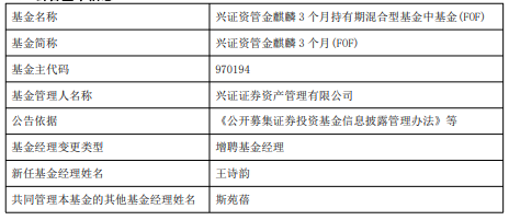 | 基金名称 | 兴证资管金麒麟 3个月持有期混合型基金中基金(FOF) | | --- | --- | | 基金简称 | 兴证资管金麒麟 3个月(FOF) | | 基金主代码 | 970194 | | 基金管理人名称 | 兴证证券资产管理有限公司 | | 公告依据 | 《公开募集证券投资基金信息披露管理办法》等 | | 基金经理变更类型 | 增聘基金经理 | | 新任基金经理姓名 | 王诗韵 | | 共同管理本基金的其他基金经理姓名 | 斯苑倩 | 兴证资管金麒麟3个月(FOF)A/C成立于2022年9月5日,截至2025年12月12日,其今年来收益率为 26.37%、26.87%,成立来收益率为11.25%、10.95%,累计净值为1.7369元、1.1095元。 中国经济网北京12月15日讯 近日,兴证证券资产管理有限公司公告,兴证资管金麒麟3个月(FOF)增聘 王诗韵。 王诗韵2018年7月进入金融行业,曾任中国工商银行权益投资经理。2021年10月加入兴证证券资产管理 有限公司,历任大类资产配置部基金评价、投资经理助理,公募组合投资部投资经理助理,公募业务部 公募投资经理助理,固收研究部研究员,公募 ...