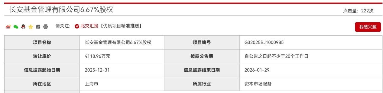 近日,长安基金6.67%股权在北京产权交易所挂牌,转让方为兵器装备集团财务有限责任公司,底价为4118.96万元。记者注意到,这部分股权并不是第一次 挂牌转让,早在2021年和2022年,就曾以3700万元的底价多次挂牌转让。 与长安基金股东方寻求股权转让不同的是,近期华润元大基金则是寻求引入投资方,此次拟募集资金对应的持股比例达24.5%,若增资成功,新投资方将成 为公司的第二大股东。 长安基金6.67%股权再转让 北京产权交易所的一则信息显示,长安基金6.67%股权于近日挂牌转让,转让底价为4118.96万元。 | 项目名称 | 长安基金管理有限公司6.67%股权 | 项目编号 | G32025BJ1000985 | | --- | --- | --- | --- | | 转让底价 | 4118.96万元 | 披露公告期 | 自公告之日起不少于20个工作日 | | 信息披露起始日期 | 2025-12-31 | 信息披露结束日期 | 2026-01-29 | | 所在地区 | 上海市 | 所属行业 | 资本市场服务 | 公开资料显示,长安基金目前共有5位股东,此次挂牌转让的股权来自于兵器装备集团财务有限责 ...