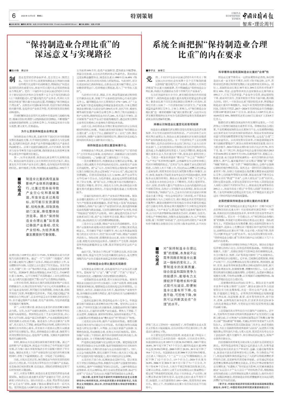 编者按制造业是立国之本、强国之基。2025年5月,习近平总书记在河南考察时指出:"制造业是国民经济的重要支柱,推进中国式现代化必须保持制造业 合理比重。"党的二十届四中全会审议通过的《中共中央关于制定国民经济和社会发展第十五个五年规划的建议》提出,保持制造业合理比重,构建以先 进制造业为骨干的现代化产业体系。中国经济时报约请知名智库专家,从历史大势、时代大潮、世界大局等维度,探析保持制造业合理比重的机理和规 律。 为何须保持制造业合理比重 核心观点 制造业比重的高低直接影响产业体系的健康运行,比重过低容易导致产业空心化和基础薄弱,而盲目追求过高指标,则可能引发资源错配、结构失衡,抑 制其他部门发展,降低整体经济效率。提出"保持制造业合理比重"旨在通过稳固产业基础、优化产业结构,为经济高质量发展提供可靠保障。 ■张小锋 来以丰 制造业是国家经济命脉所系,是立国之本、强国之基。习近平总书记高度重视制造业在我国经济建设和现代化进程中的战略地位,明确指出"制造业是国 民经济的重要支柱,推进中国式现代化必须保持制造业合理比重"。党的二十届四中全会审议通过的《中共中央关于制定国民经济和社会发展第十五个五 年规划的建议》( ...